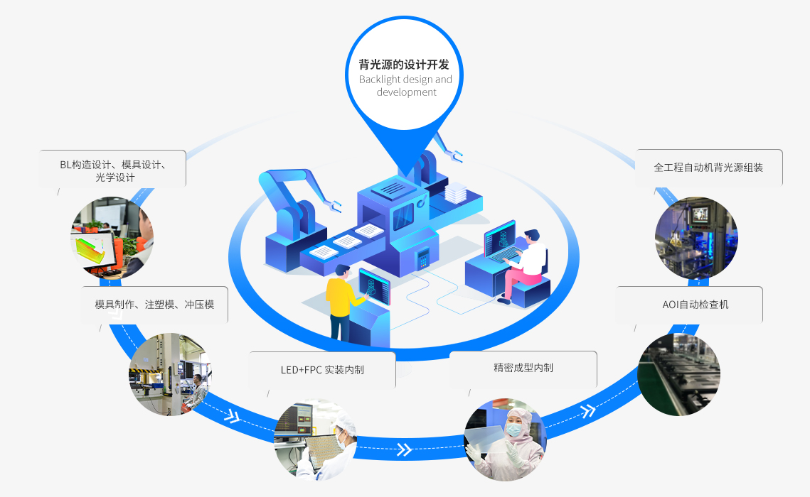 公司深耕背光显示模组领域;通过持续不断的技术创新;不断加深的一体化生产能力;持续打造技术领先、质量过硬、服务周全的优质产品。通过多年模具设计及制作经验,利用日本高精度模具加工等设备;紧贴客户需求,重视产品组合开发,向客户提供一站式专业产品及技术解决方案。
